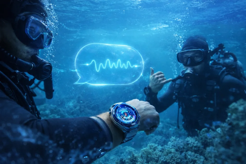 Ancak fark yaratan asıl özellik, sonar tabanlı su altı iletişim teknolojisi. WATCH Ultimate 2, su altında yalnızca veri toplayan pasif bir cihaz değil; aktif bir iletişim aracı.