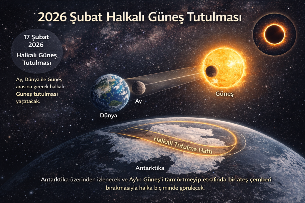17 Şubat 2026 halkalı Güneş tutulması, Türkiye’den gözlemlenemeyecektir. Tutulmanın halkalı evresi yalnızca Antarktika üzerinden izlenebilecektir.